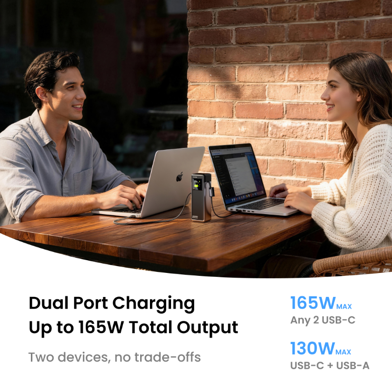 SHARGE X6 專為通勤與流動辦公而設,支援雙端口同時快充,總輸出最高 165W :任意 2×USB‑C 可達 165W ,USB‑C+USB‑A 最高 130W ,兩部裝置同步補電更省時。