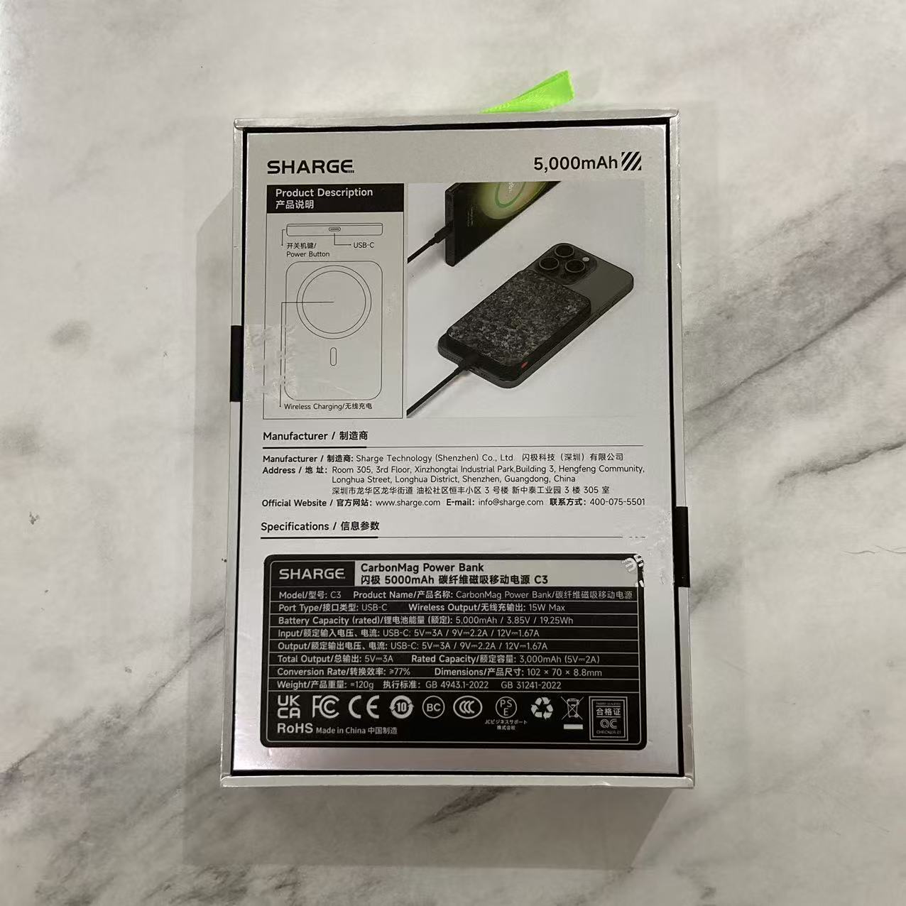 SHARGE Qi 碳纖維磁吸行動電源 5000mAh C3 #1711 ( 陳列品/瑕疵品特價出售 )