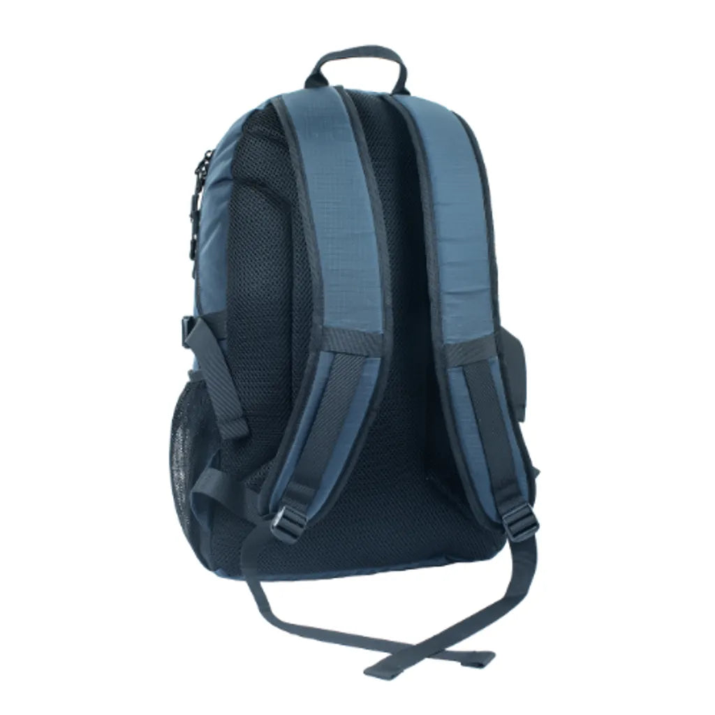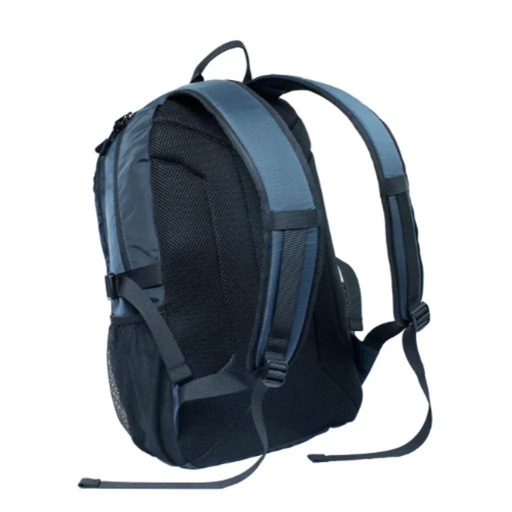外側方面,前置拉鍊收納袋讓常用小物(如鎖匙、紙巾、卡套)更易拎取;兩側配備彈性網袋可放水樽或雨傘。另有雙側可調壓縮帶,可按內容物多寡調節,令背包更貼身穩定、減少行走時晃動。背負舒適度方面,背板採用高密度泡棉+透氣網布,有助分散壓力並保持透氣,適合長時間背負。