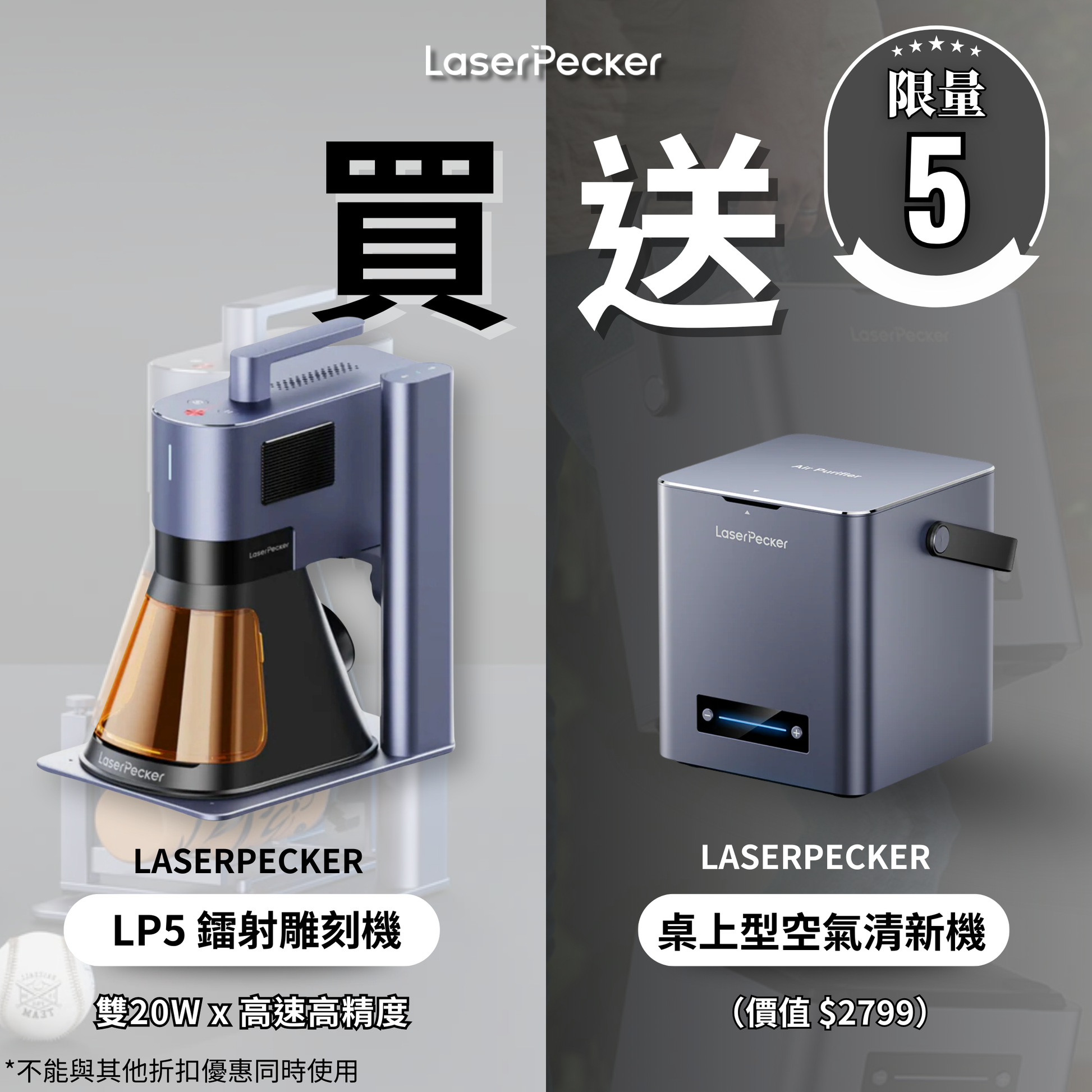 LASERPECKER LP5 雙 20W 鐳射雕刻機|光纖與二極管雙光源|高速 10,000mm/s 雕刻精度